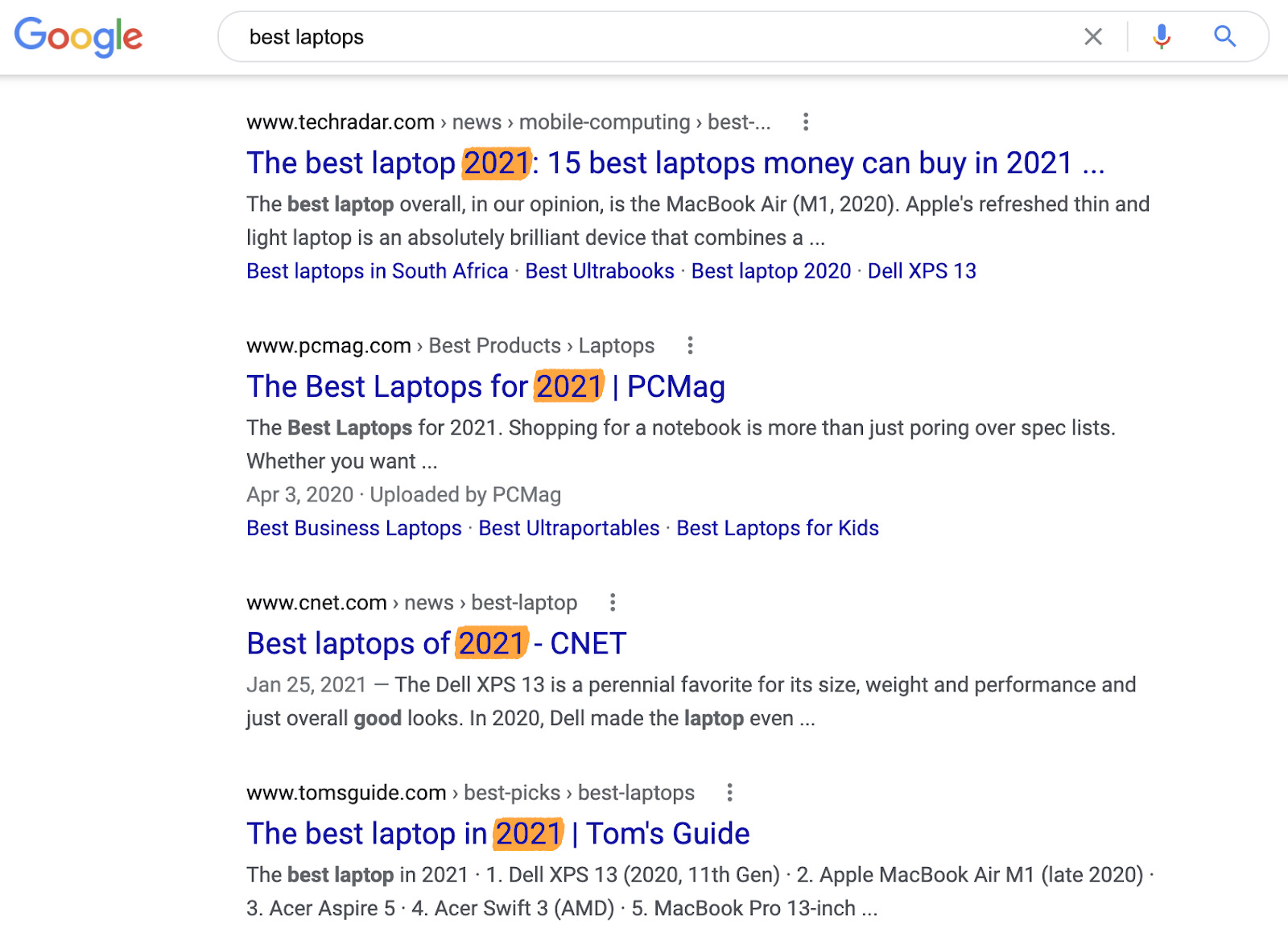 Por ejemplo, el ángulo para “best laptops” (mejores portátiles) es claramente la novedad, ya que todos los resultados tienen el año actual en el título.