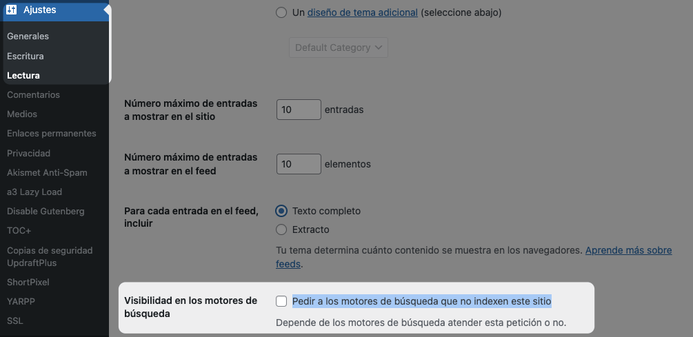 La encontrarás en Ajustes > Lectura > Visibilidad en los motores de búsqueda: