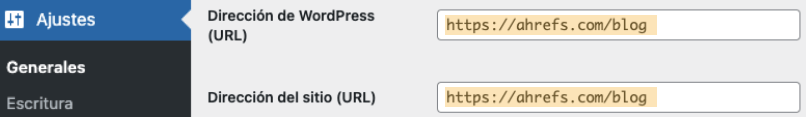 Google mira el dominio.com y www.dominio.com por separado, así que es importante elegir la versión preferida para tu sitio. Puedes hacer esto en Ajustes > General. Simplemente establece la Dirección de WordPress (URL) y la Dirección del sitio (URL) con tu versión preferida.
