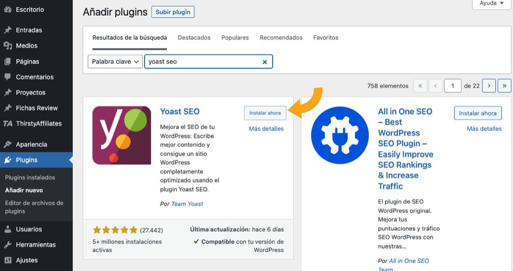 Para instalarlo, ve a Plugins > Añadir Nuevo > Busca “Yoast SEO” > Haz clic en Instalar Ahora > Haz clic en Activar: