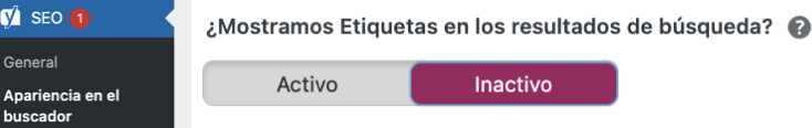 Para hacerlo ve a SEO > Apariencia en el buscador > Taxonomías > Desactiva “¿Mostramos Etiquetas en los resultados de búsqueda?”: