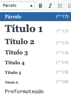 En WordPress, puedes usar el editor WYSIWYG (el editor visual, what you see is what you get, lo que ves es lo que obtienes) para añadir rápida y fácilmente títulos relevantes. Simplemente pulsa en el desplegable de “Párrafo” y verás seis opciones de titular: