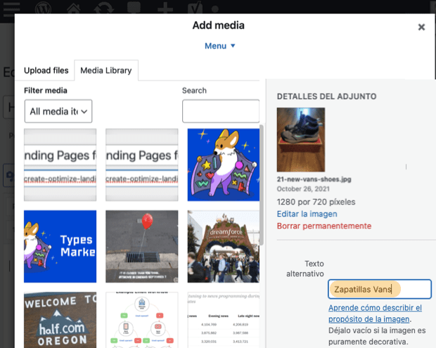 Para añadir alt text o texto alternativo en WordPress, rellena el campo “texto alternativo” al subir la imagen:
