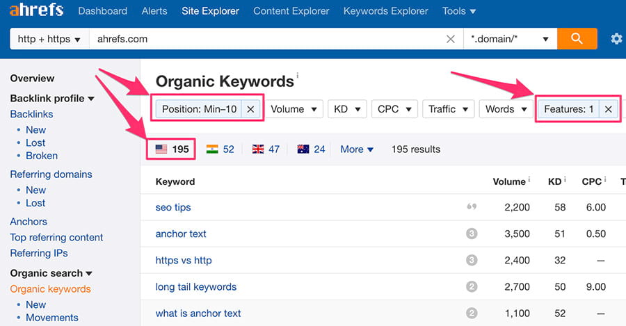 Last year, Ahrefs jumped on this bandwagon by introducing support for all sorts of “SERP features” in the Site Explorer and Keywords Explorer tools.