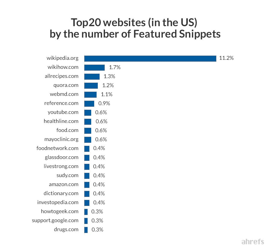 I’m sure you won’t be surprised if I say that Wikipedia is the absolute leader in the amount of featured snippets it owns.