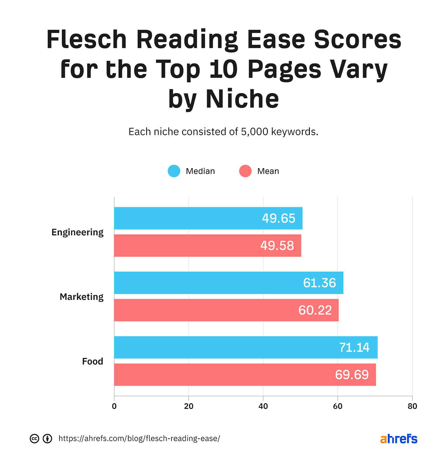 We ended up with 5,000 keywords in each category, which means we analyzed 15,000 keywords and SERPs in total. Some pages (19% in engineering, 9% in marketing, 10% in food) were excluded from the study because it wasn’t possible to reliably calculate the Flesch Reading Ease score for them.