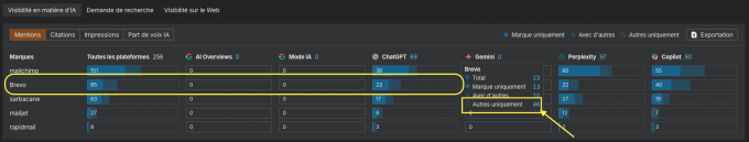 Puis rendez-vous dans Mentions, survolez votre marque et sélectionnez Autres uniquement pour repérer les creux de mentions IA.