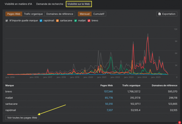 Ou consultez le rapport Pages Citées pour voir quelles URLs sont citées par les LLMs lorsqu’ils évoquent votre marque.