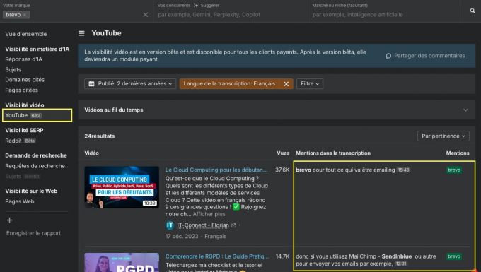 YouTube étant la deuxième source la plus citée par les LLMs, Brand Radar surveille en continu les mentions de marque dans les miniatures, titres, descriptions et même dans les retranscriptions YouTube.