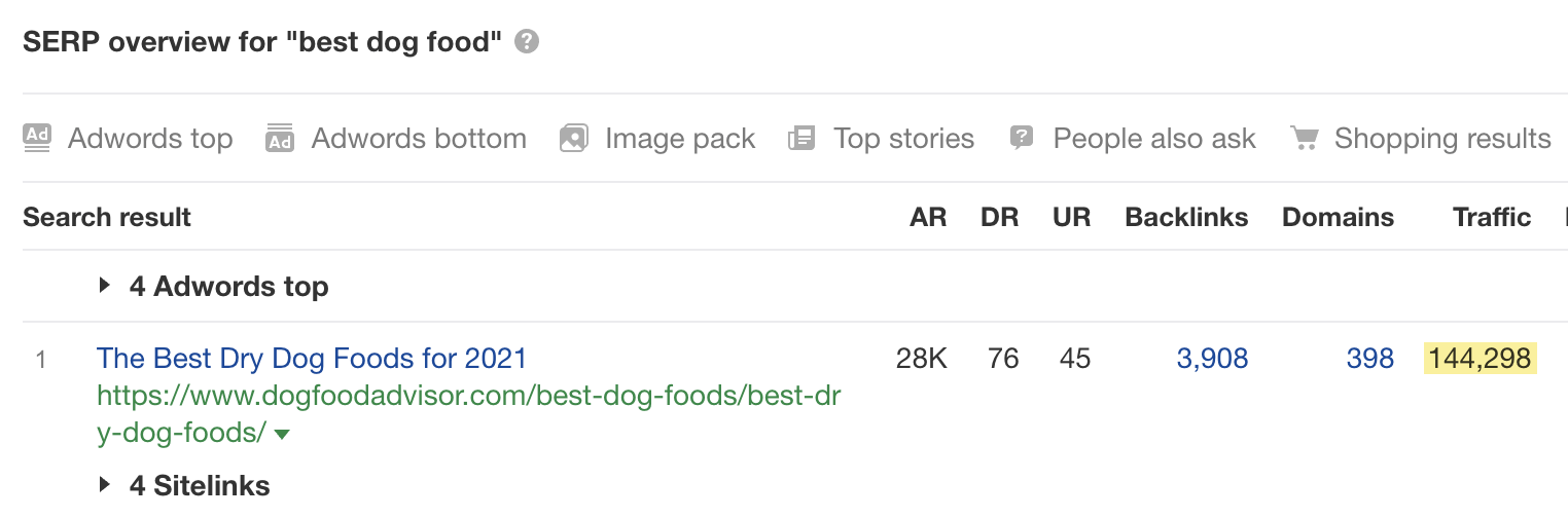 La page en première position a un volume de trafic organique estimé de 144 298 visites. C’est plus du double du volume de recherche pour “best dog food”.