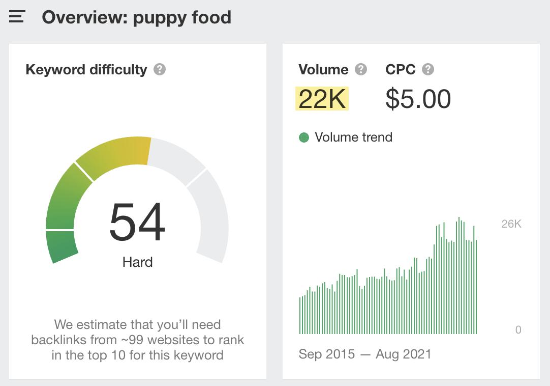 À l’inverse, certains mots-clés vont attirer moins de trafic que ce à quoi vous pourriez vous attendre au vu des volumes. Par exemple, le mot-clé “puppy food” (nourriture pour chiot) a un volume de recherche de 22K…