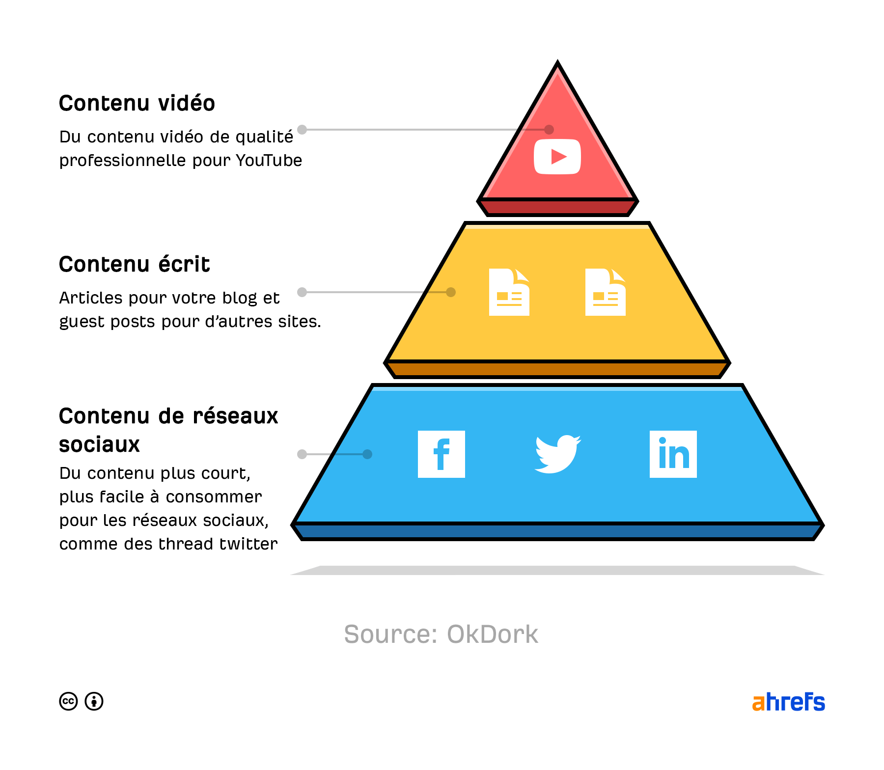 Voyez cela comme une pyramide. On commence avec une version, et on la décompose petit à petit en plus petites versions pour d’autres canaux de diffusion.