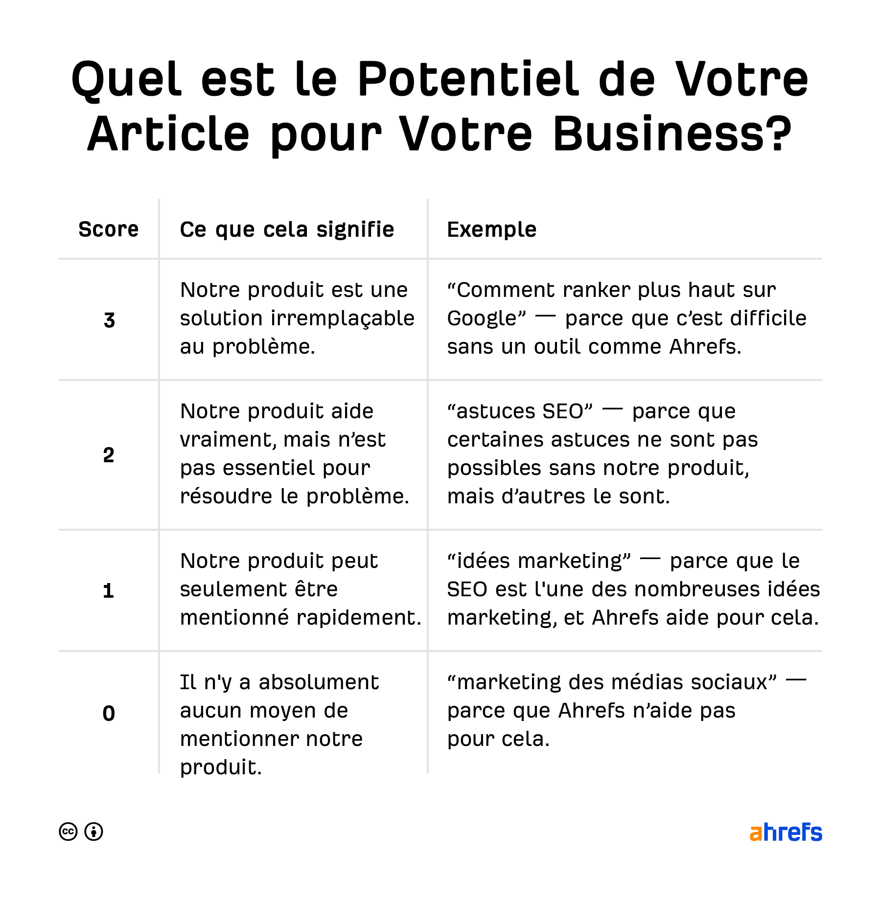 Examinez la liste et classez ces sujets selon leur potentiel commercial. Voici le tableau que nous utilisons à Ahrefs :