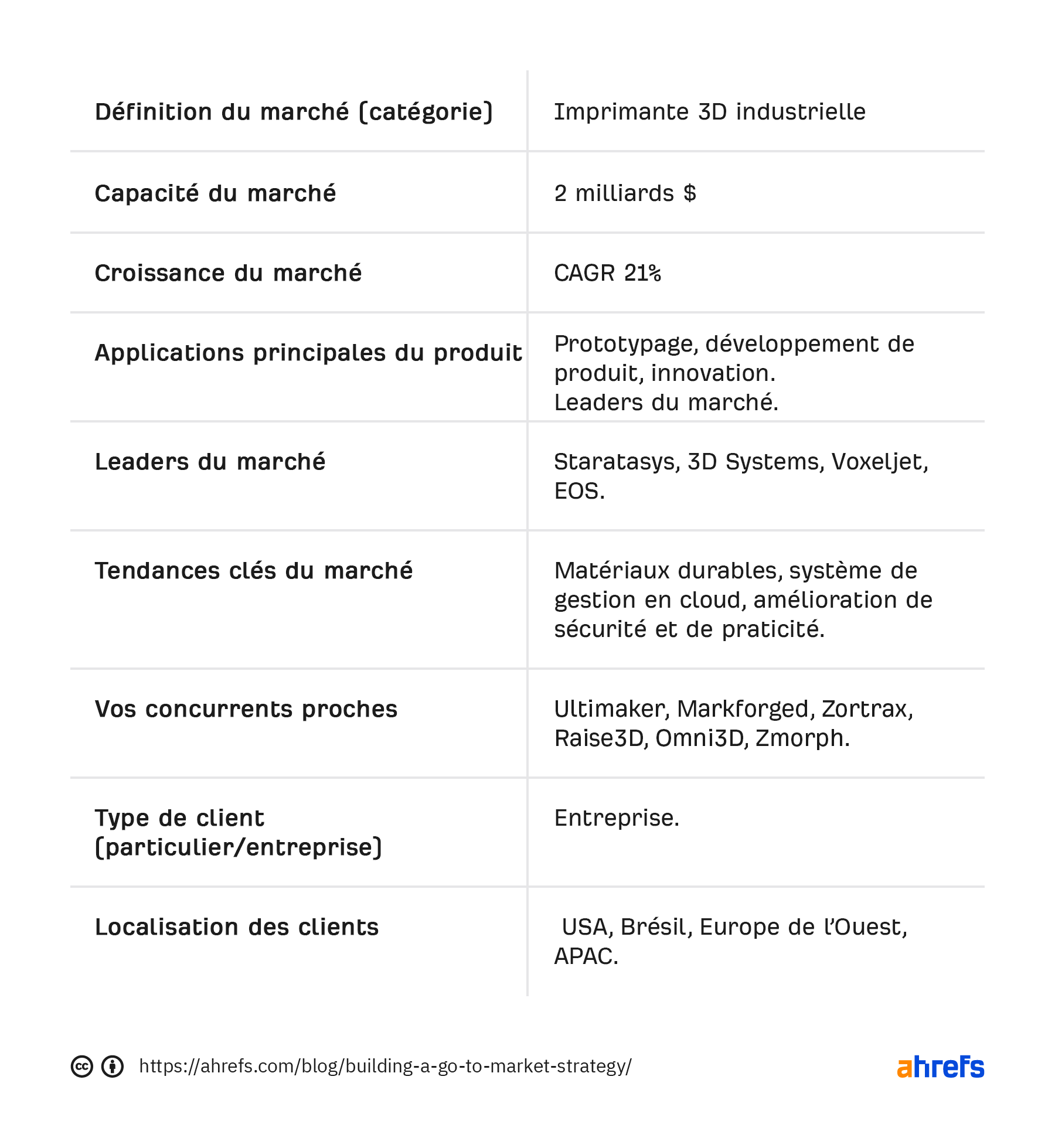 Pour relier tous les points de votre étude de marché, voici un tableau. Nous l’avons rempli avec des fausses données sur le secteur de l’impression 3D. Si vous pouvez le remplir en vous basant sur votre étude, vous pouvez aller plus loin dans le processus de GTM.