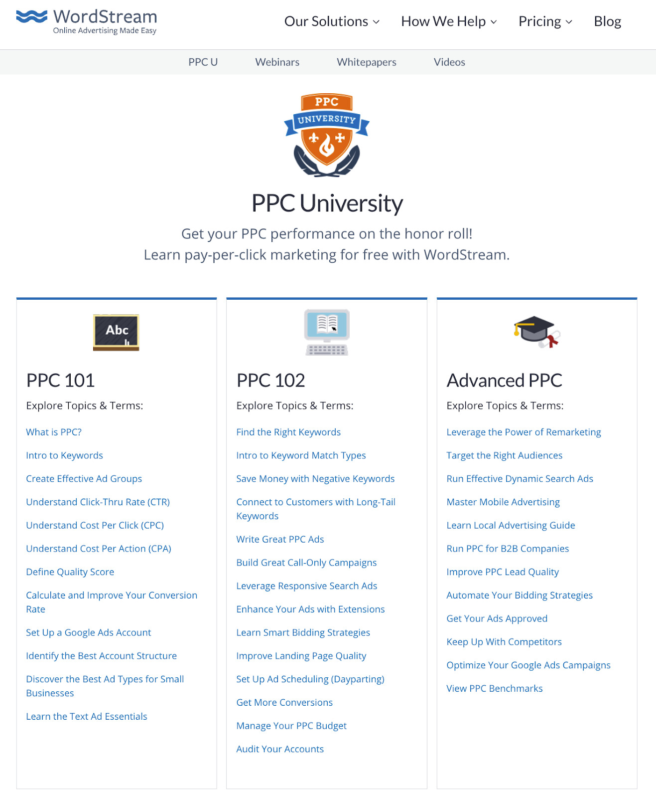 Vous êtes curieux des modèles PPC ? Laissez Wordstream vous guider. Son université PPC propose trois guides pour vous donner tout le savoir pour faire vos recherches de mots-clés, participer à des enchères Google AdWord et optimiser vos campagnes Google Ads.