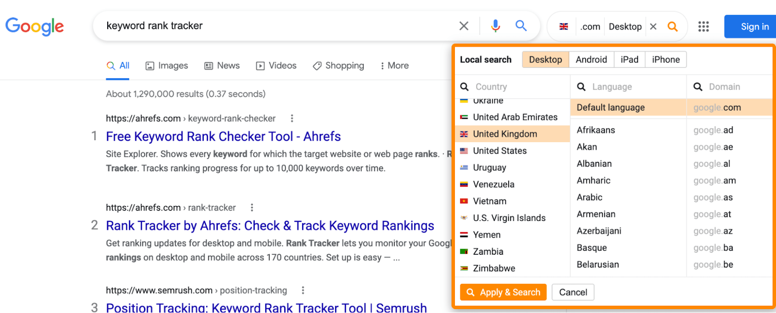 Vous pouvez vous servir de la barre d’outils SEO Ahrefs pour simuler gratuitement une recherche dans un pays ou une langue de votre choix.