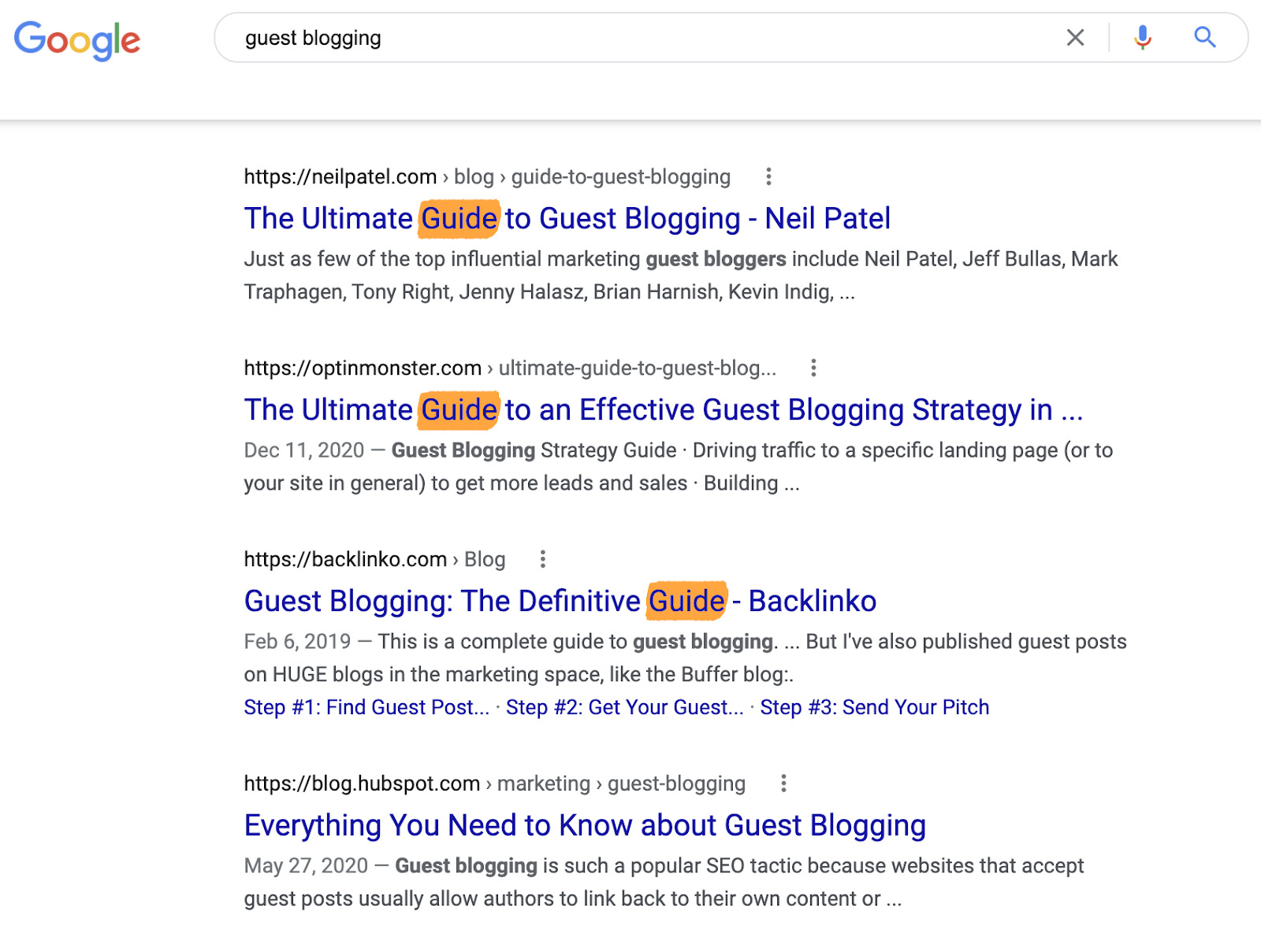 Par exemple, si on fait une recherche Google pour “guest blogging”, on voit que les articles qui se positionnent le mieux sont des guides :