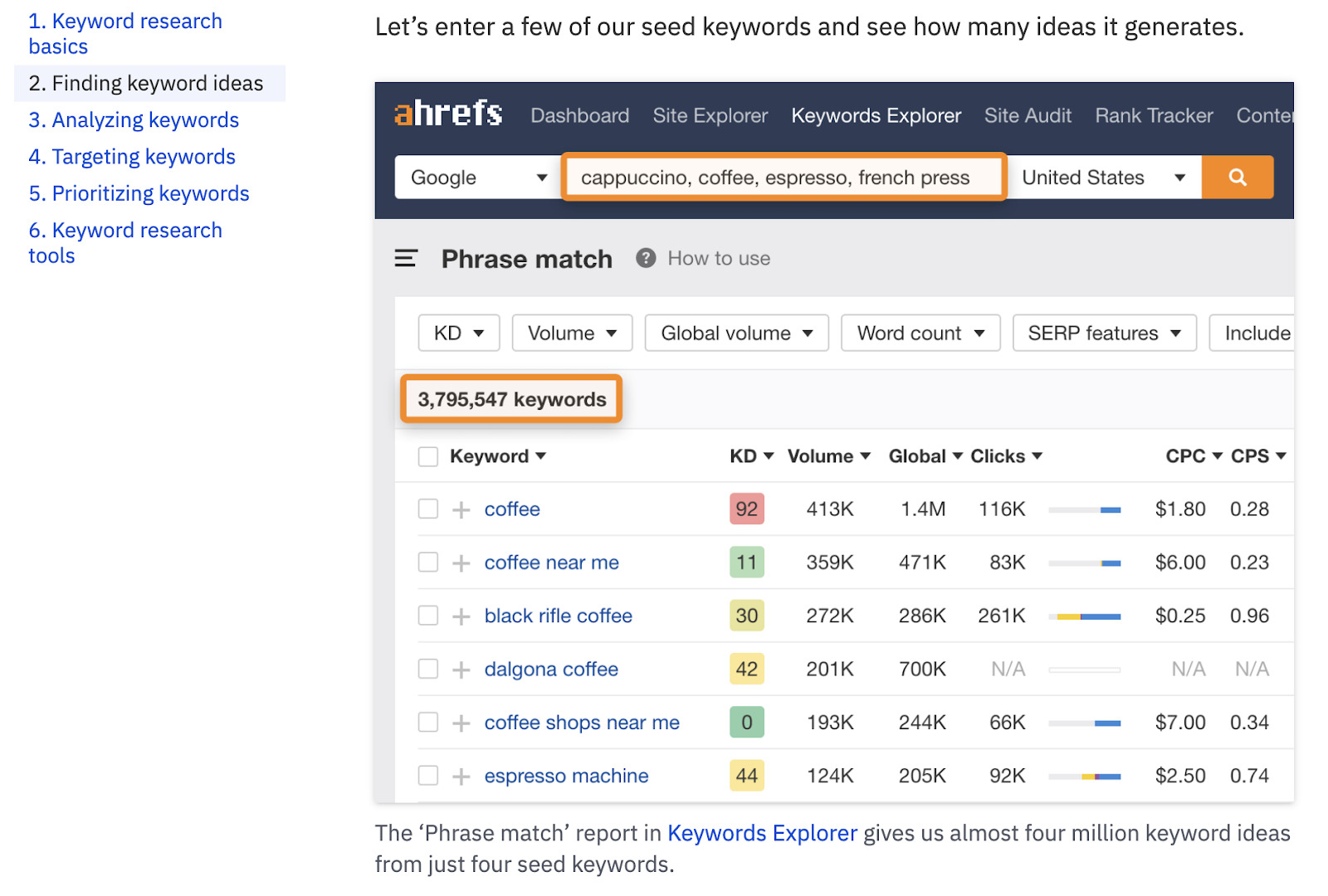 - Ajoutez les idées de sujets que vous avez trouvés dans un outil de recherche de mots-clés comme notre Keywords Explorer.