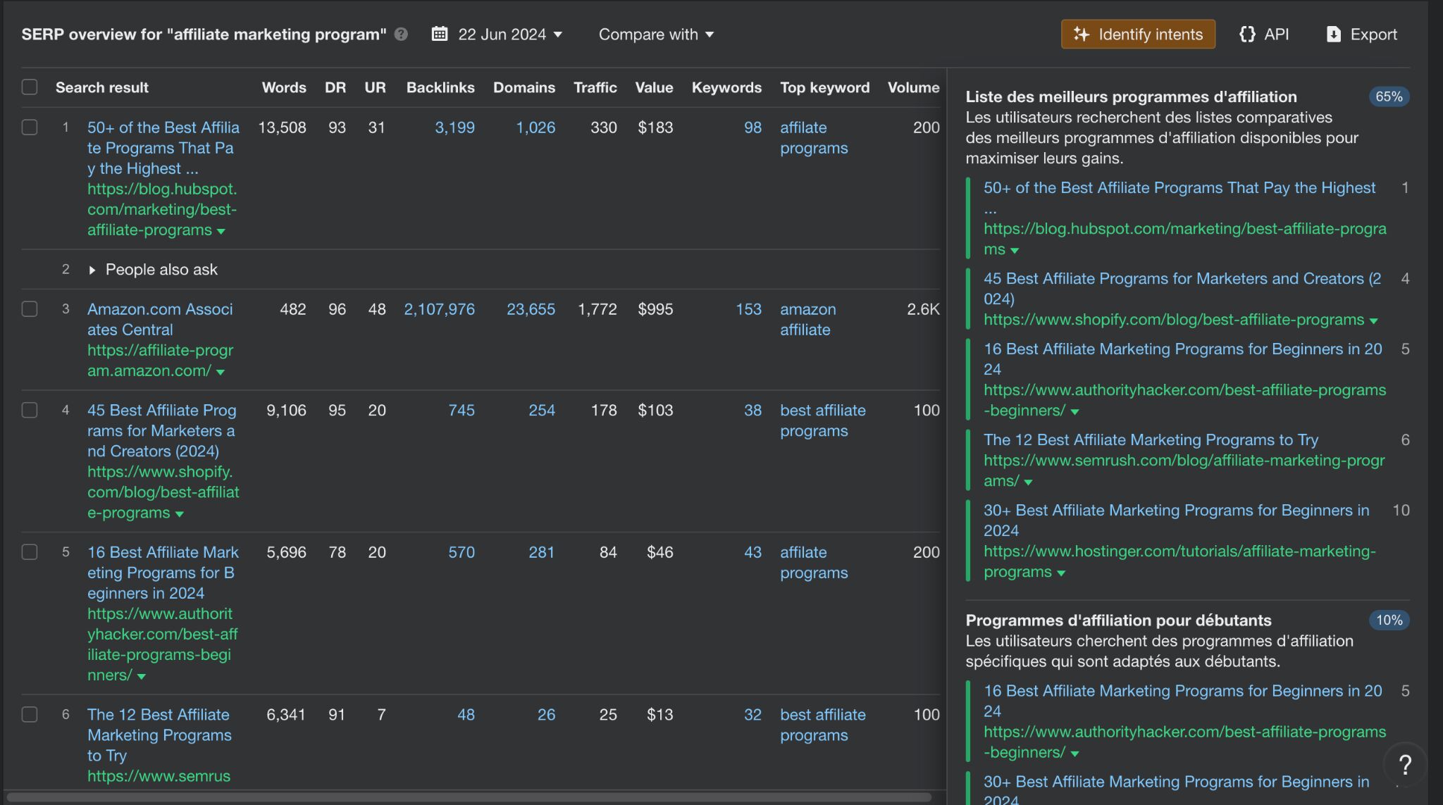 Enfin, vous pouvez également utiliser la fonctionnalité “Identifier les intentions” dans le “Keywords Explorer” (Vue d’ensemble) pour connaître l’objectif dominant des utilisateurs sur une requête spécifique. Voici un exemple avec le mot-clé “Affiliate marketing program”.