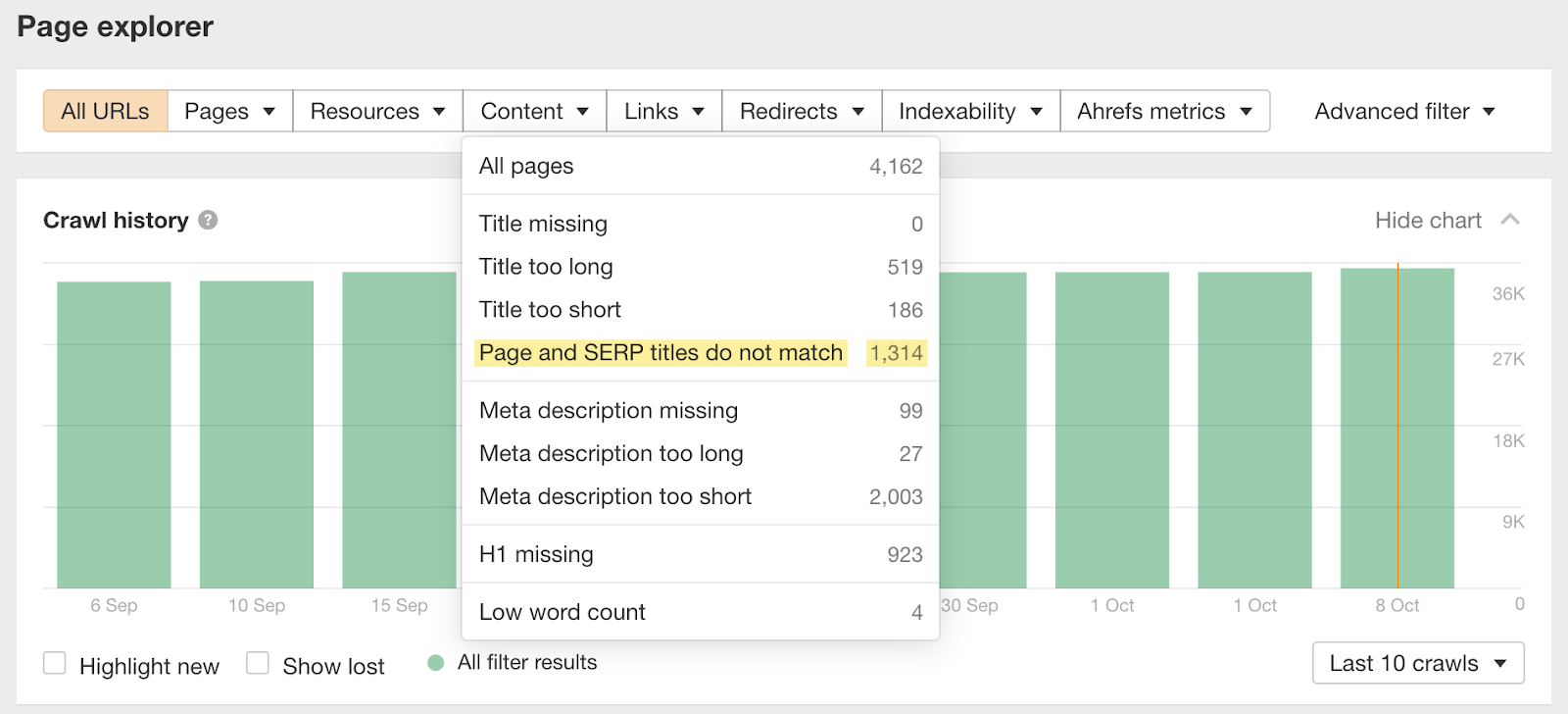 Quoiqu’il en soit, ce dont vous devez vous soucier est de savoir si ces changements affectent vos pages. Par exemple, Google réécrit actuellement 31,6 % (1 314 cas sur 4 162 pages) les balises title de ahrefs.com :