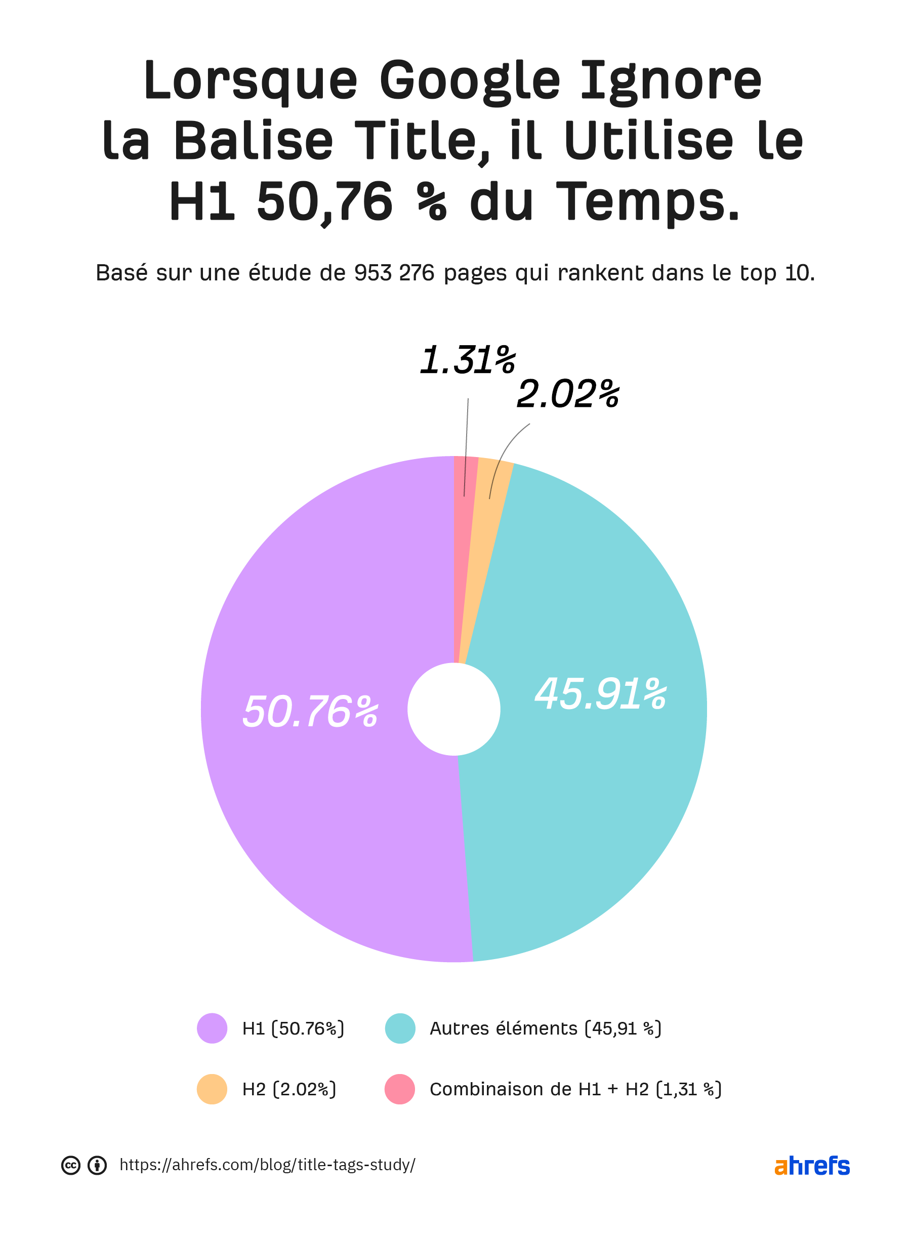 Lorsque Google ignore la balise title, il utilise le H1 50,76 % du temps.
