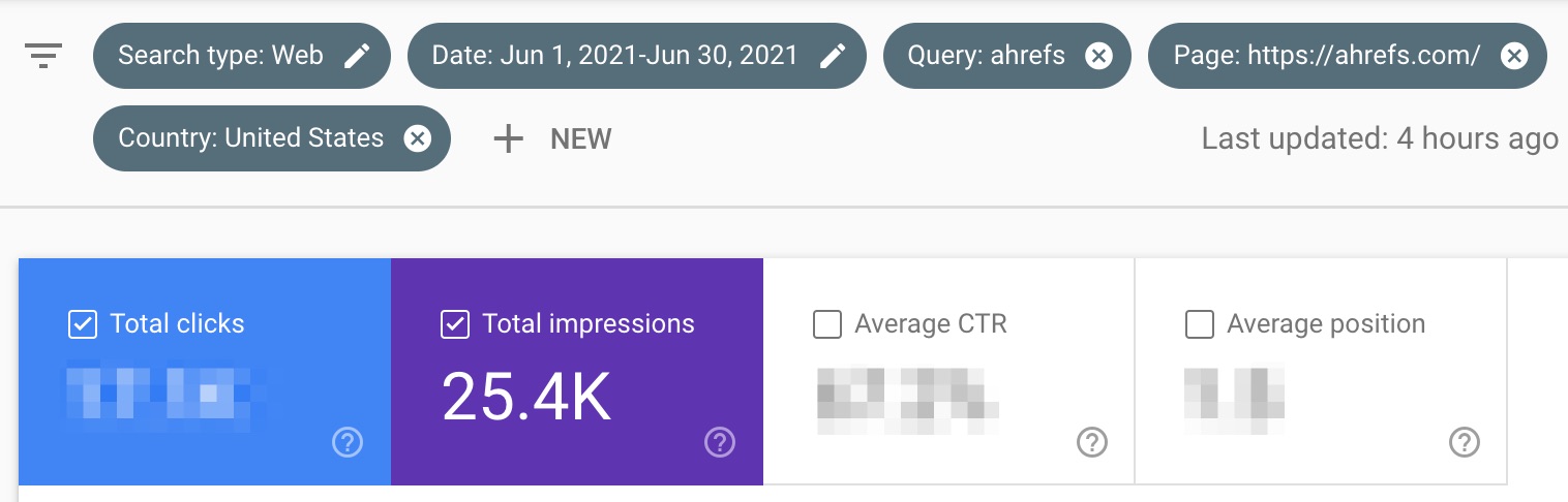 Selon les données de notre GSC, le mot-clé “ahrefs” a eu 25 436 impressions en juin (aux USA) :