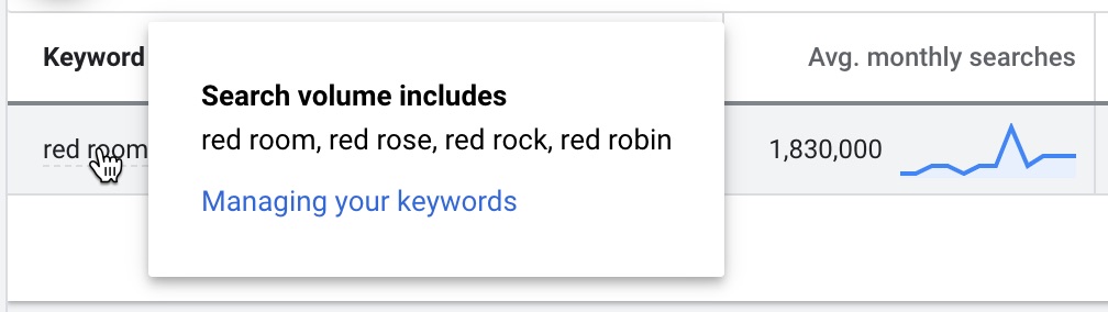Comme vous pouvez le voir, cette fonctionnalité de “regroupement” du GKP peut être très frustrante pour un professionnel du SEO. Mais on ne peut pas vraiment blâmer GKP de nous cacher des volumes précis. C’est un outil pour les publicitaires, pas pour le SEO. Ce regroupement de mots-clés similaire est en fait un avantage pour eux.