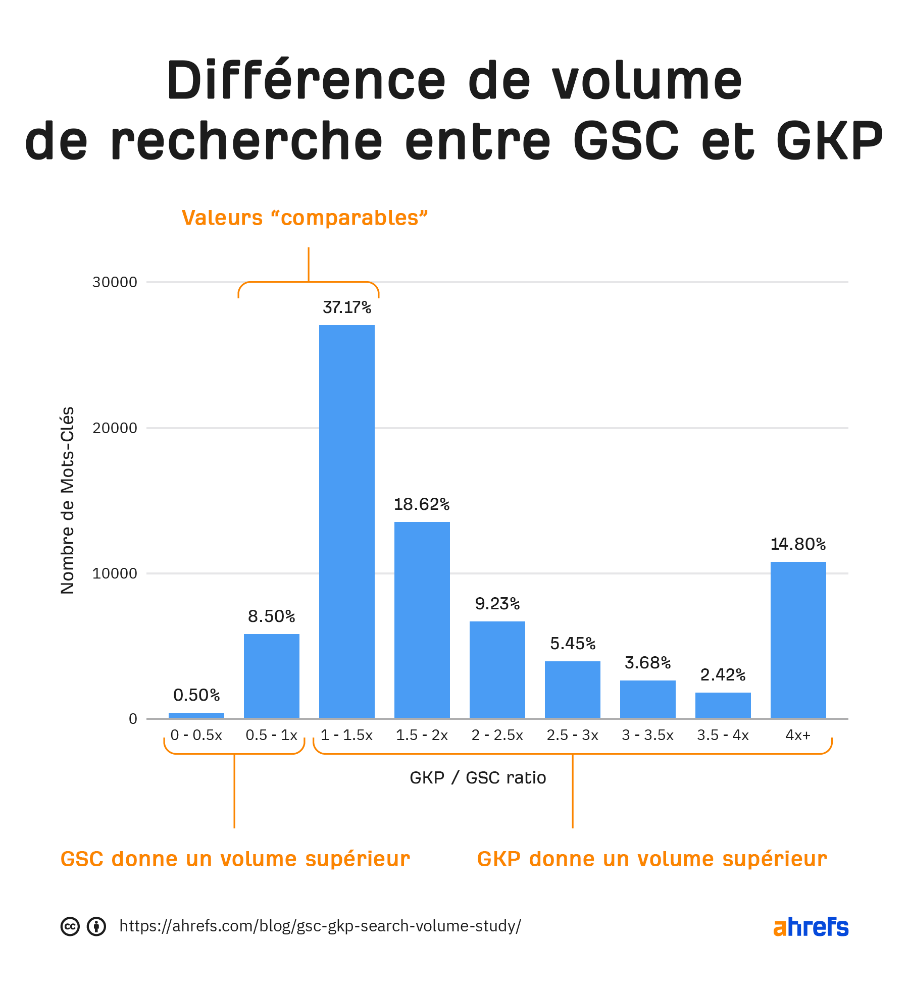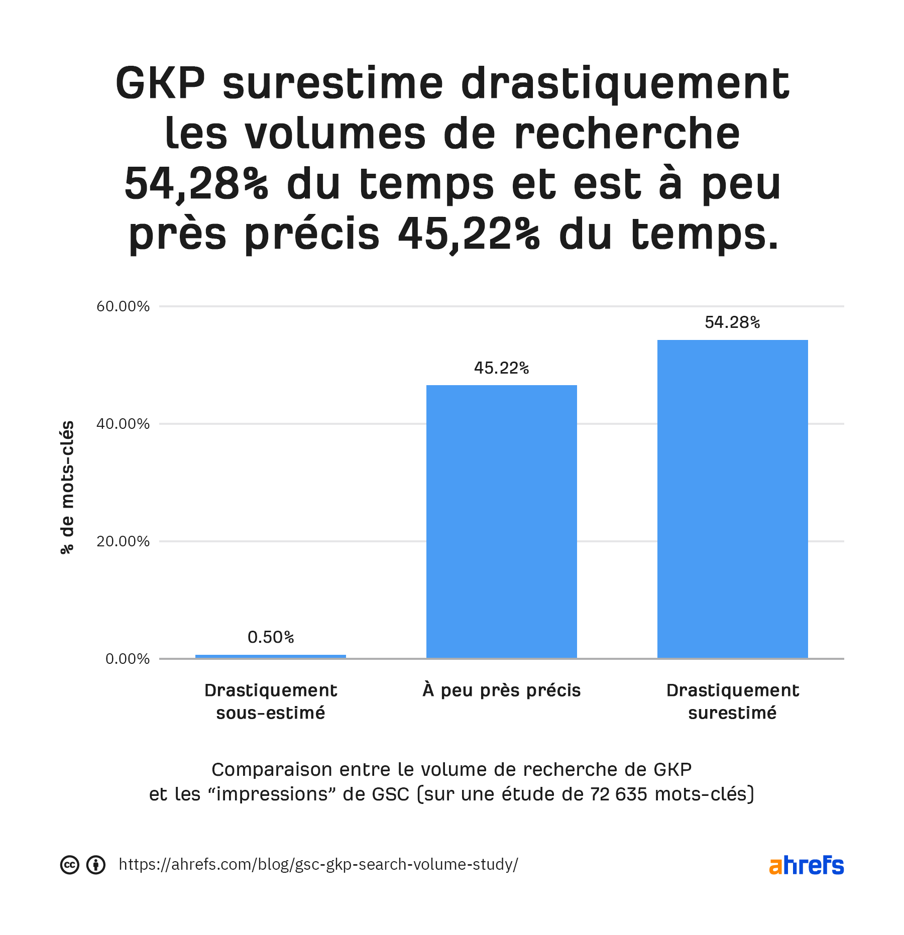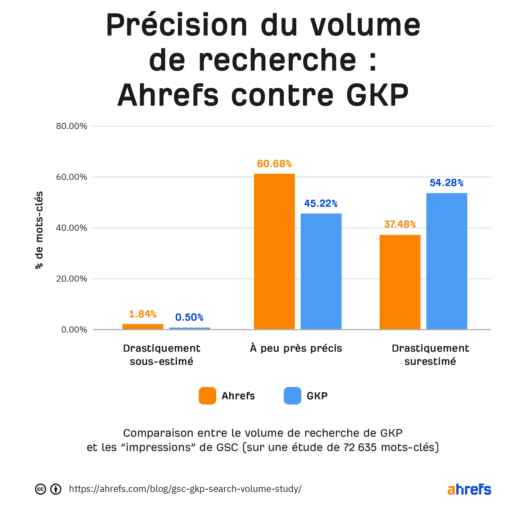 Il semblerait que Ahrefs donne des valeurs “à peu près précises” dans 60% des cas contre 45% pour GKP.