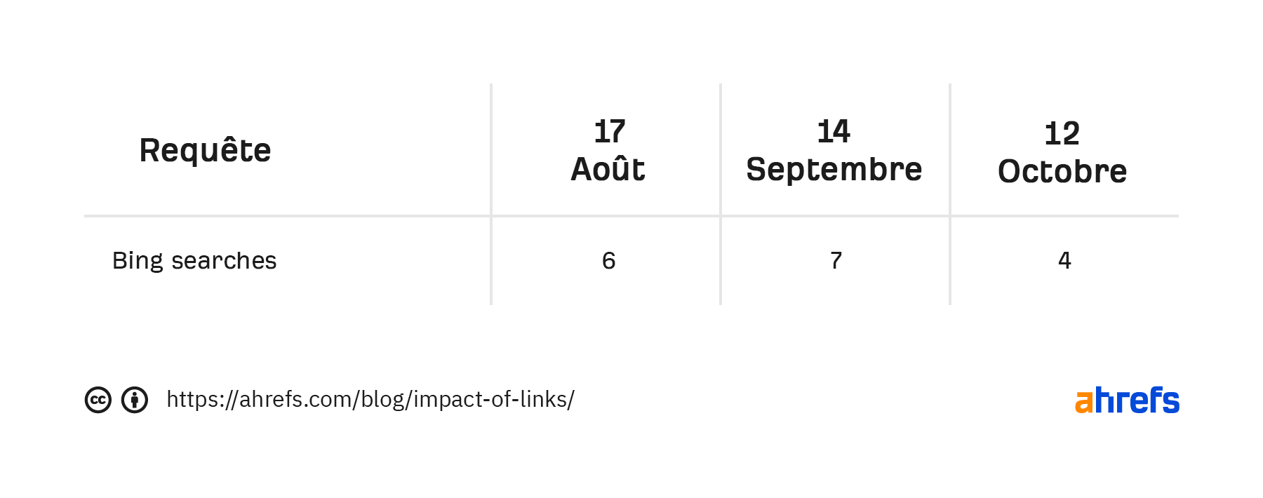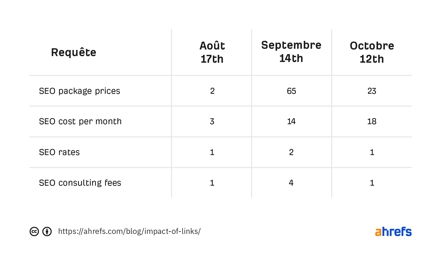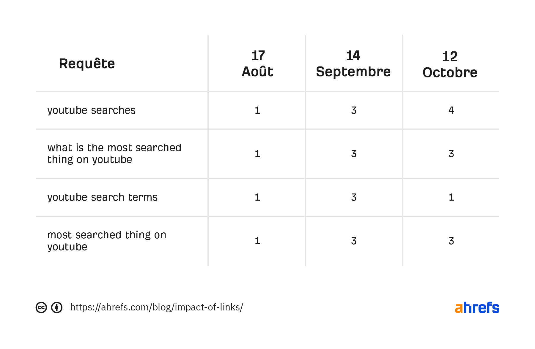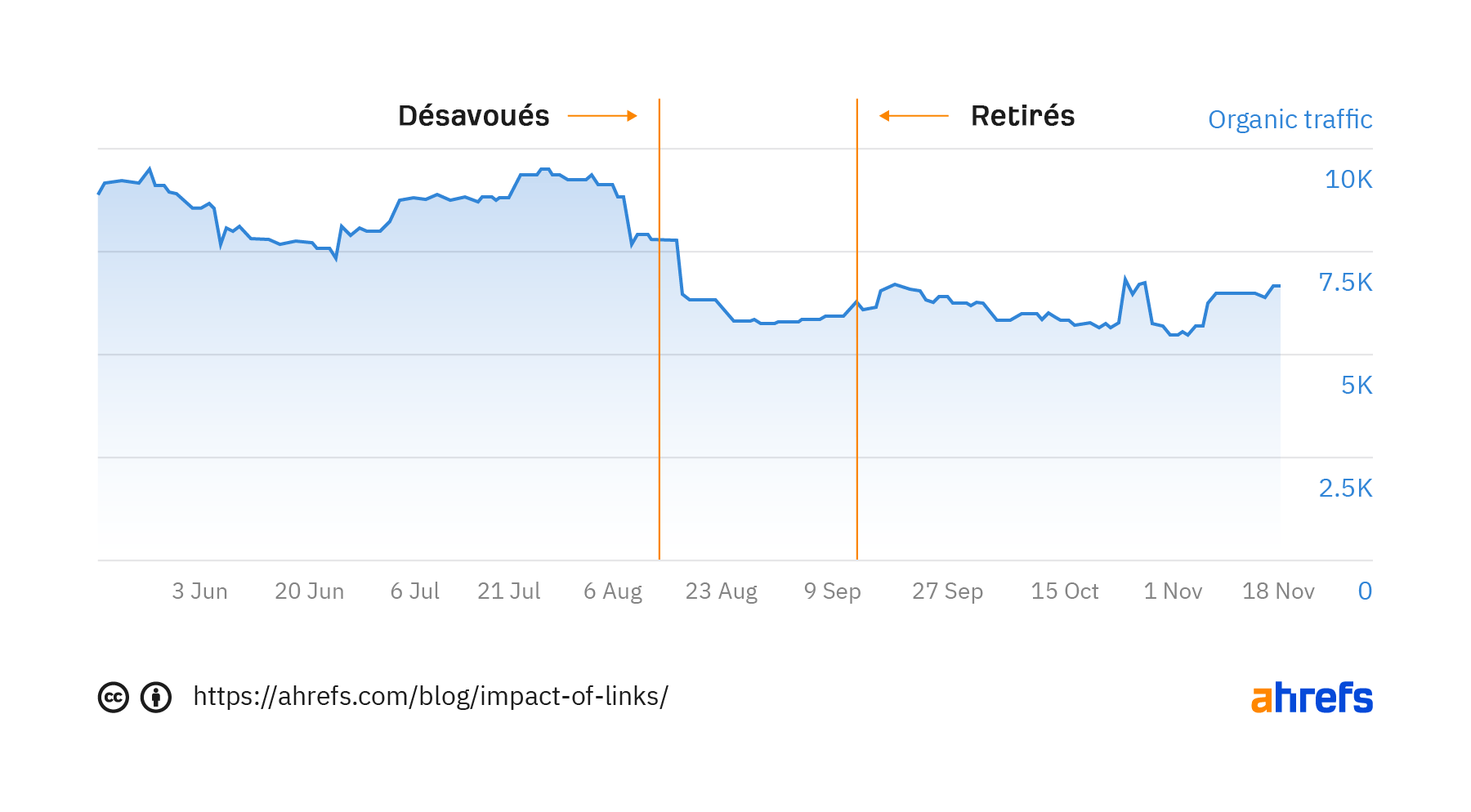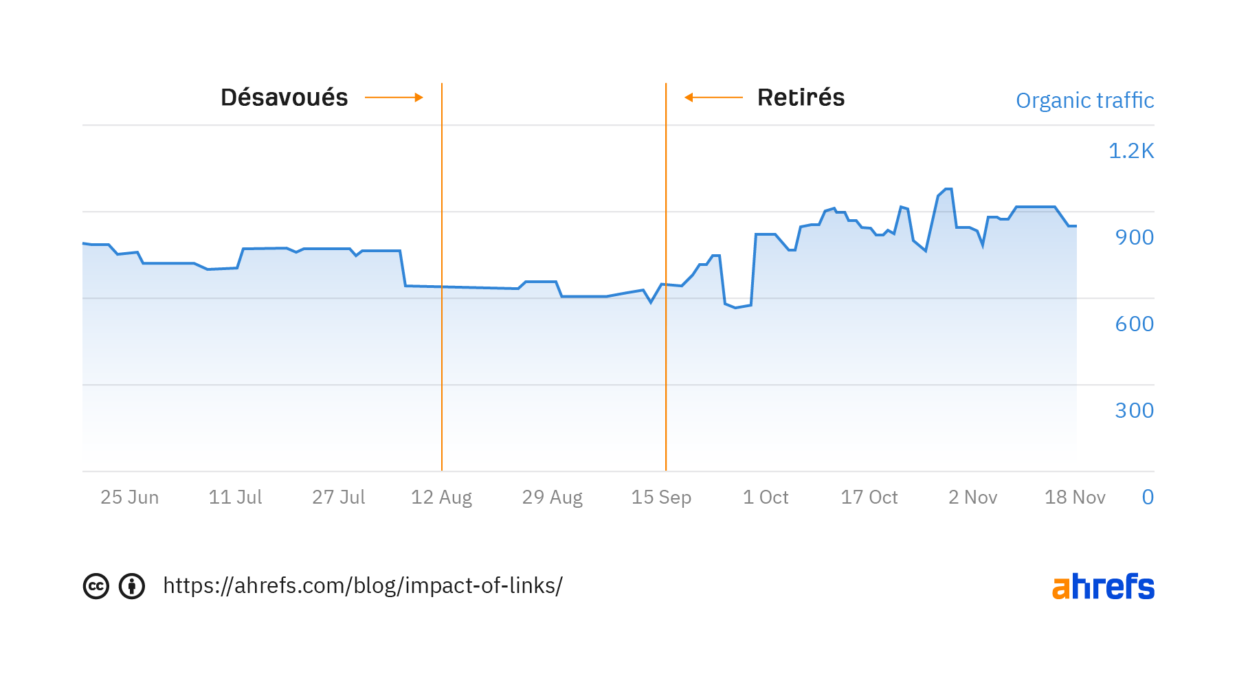Le graphique utilisé ci-dessus utilise le trafic moyen organique Ahrefs, qui est une mesure stable de la visibilité de la recherche. Cela fait une approximation du trafic en se basant sur le ranking et le CTR estimé pour tous les mots-clés sur laquelle la page se rank.