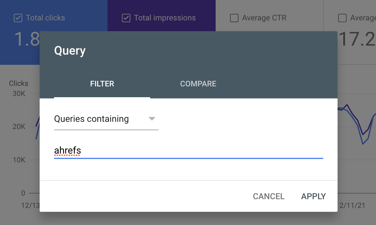 Dans l’onglet Performances, vous pouvez filtrer les recherches dans le rapport. Sélectionnez « requête » en cliquant sur le « + nouveau » tout en haut. Ajoutez le nom de votre marque et produits aux noms spécifiques, en prenant en compte les variations et les fautes de frappe. Sélectionnez « Requêtes comprenant ». Cliquez sur appliquer :