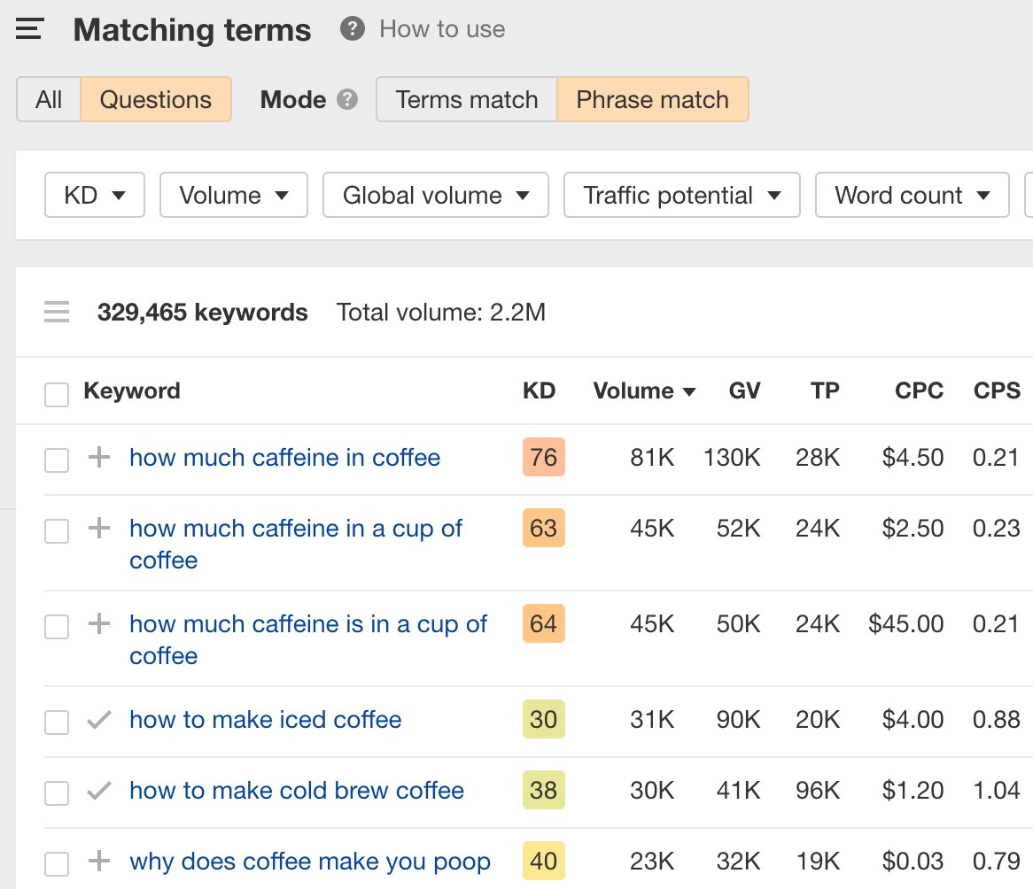 Dans cet exemple, vous voyez plus de 300 000 sujets potentiels à cibler. Parcourez la liste pour choisir ceux qui correspondent à votre site. Ensuite, créez du contenu qui va se positionner sur ces sujets.