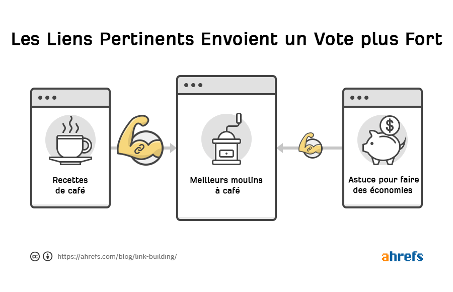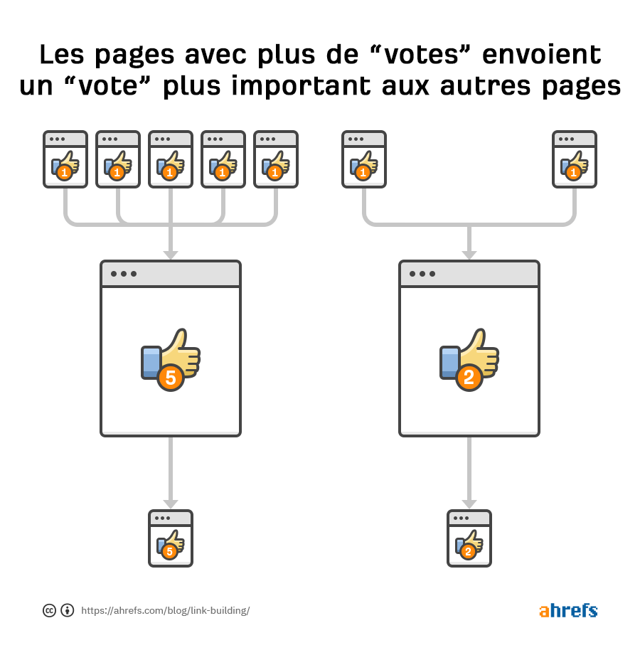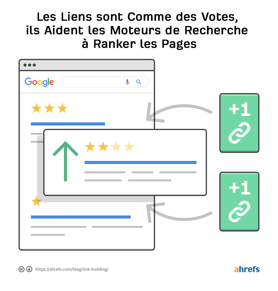 Google (et les autres moteurs de recherche) voient les liens venant des autres sites comme des “votes”. Cela va les aider à identifier quelle page sur un sujet particulier (parmi des dizaines de milliers d’autres) mérite d’être en haut de la page des résultats.