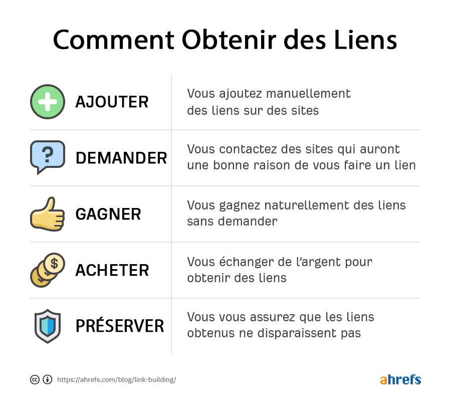 Dans le concept, la plupart des tactiques de link build sont de l’une de ces cinq catégories : Ajouter, Demander, Acheter, Gagner et Préserver.