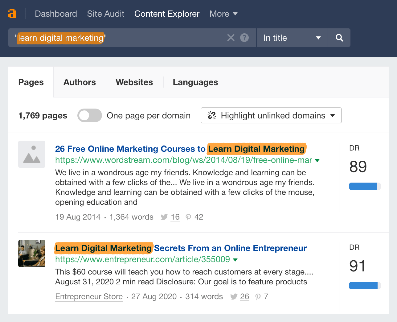 Faites une recherche sur un sujet sur lequel vous voulez écrire dans les titres des pages et classez les résultats par domaines référents. Étudier ces pages et leurs liens vous donnera des tas d’idées sur comment améliorer votre propre contenu.