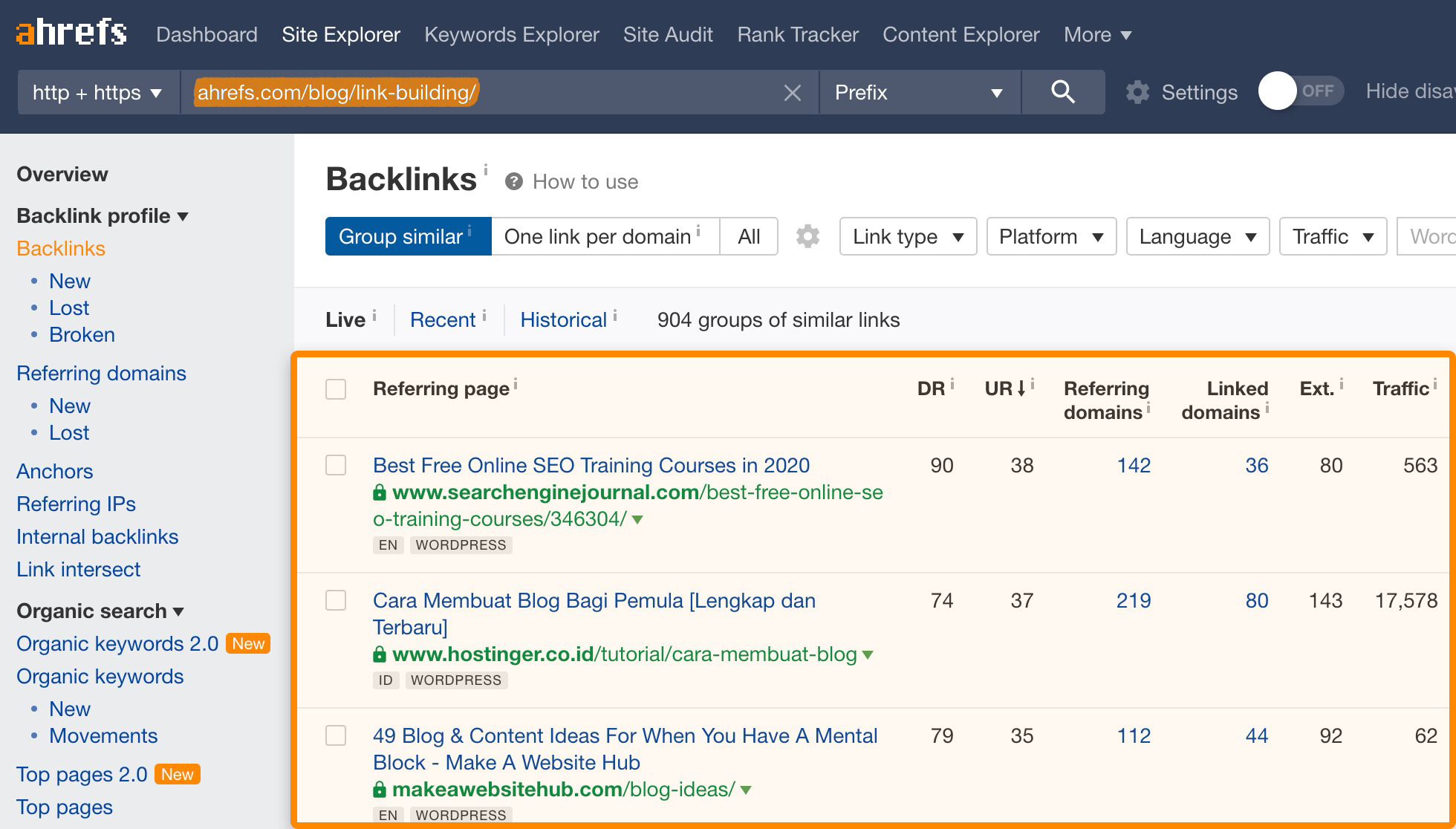 Entrez n’importe quelle URL et vous obtiendrez une liste complète de ses backlinks avec des mesures utiles et des filtres pour vous aider à trouver de bonnes opportunités.