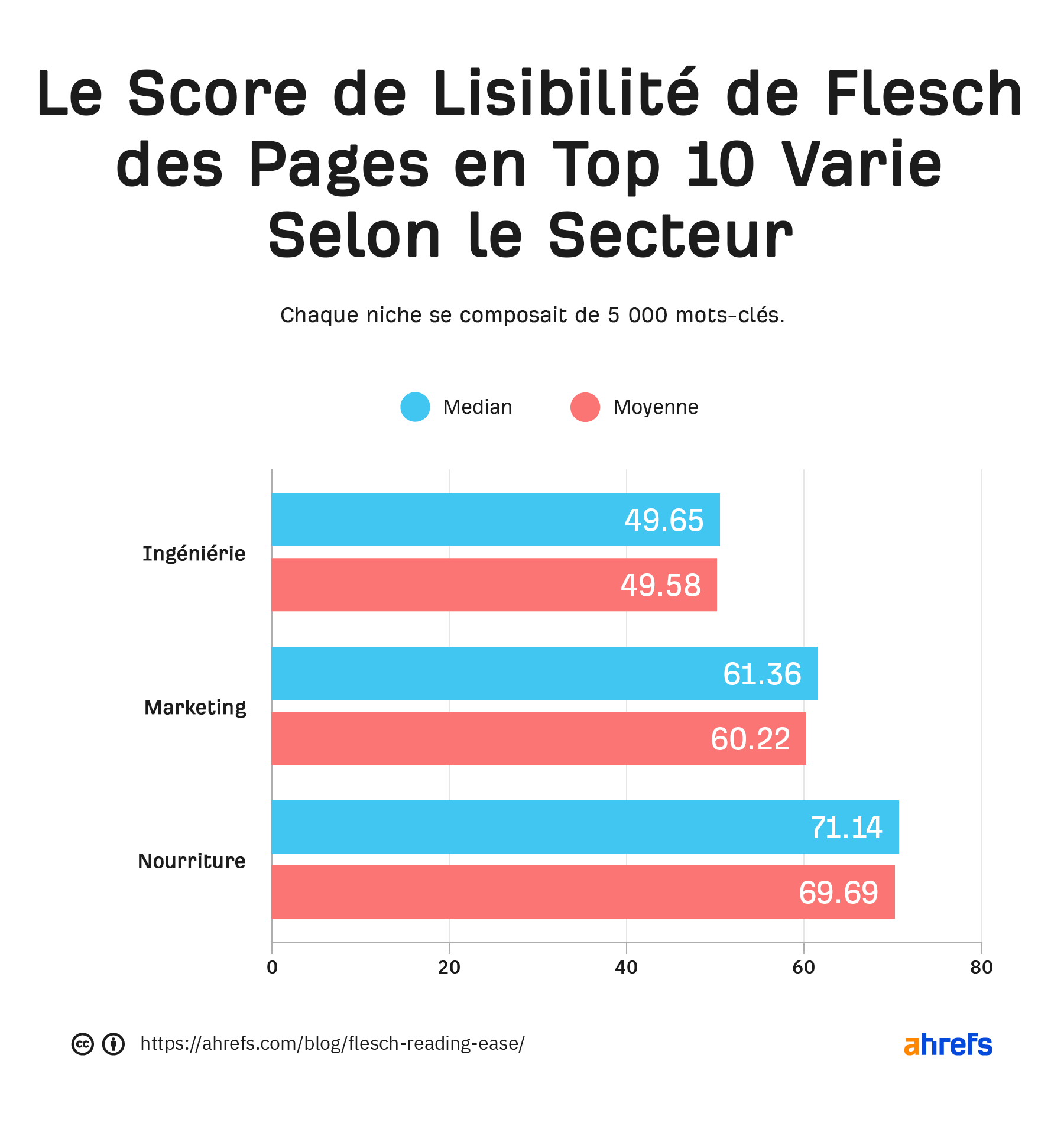 Nous avons terminé avec 5 000 mots-clés pour chaque catégorie, ce qui veut dire que nous avons analysé 15 000 mots-clés et SERP au total. Certaines pages (19 % en ingénierie, 9 % en marketing et 10 % en nourriture) ont été exclues de l’étude, car il n’était pas possible d’avoir un calcul fiable de lisibilité de Flesch dessus.