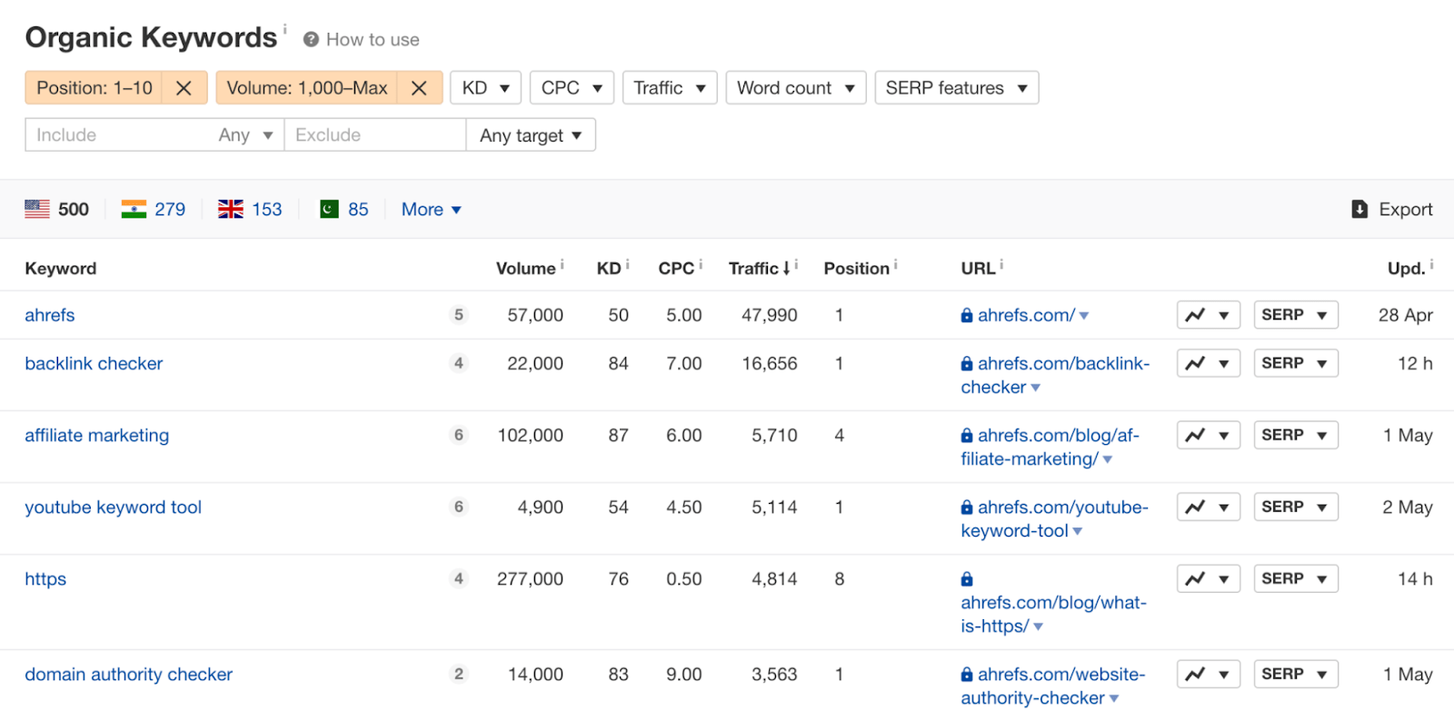 Ce rapport de mots-clés organique montre les 500 mots-clés sur lesquels Ahrefs se trouve dans le top 10 avec au moins 1000 recherches mensuelles aux USA.