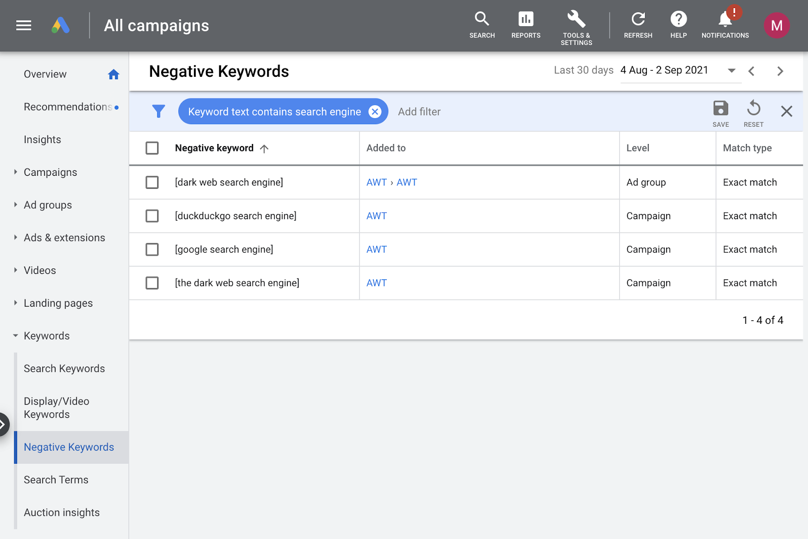 Vous allez souvent voir des cas d’enchères sur des mots-clés peu ou pas pertinents à moins d’aller vers des correspondances strictes (ce qui n’est pas une bonne idée). Les mots-clés à exclure pour vos campagnes sont appelés mots-clés négatifs.