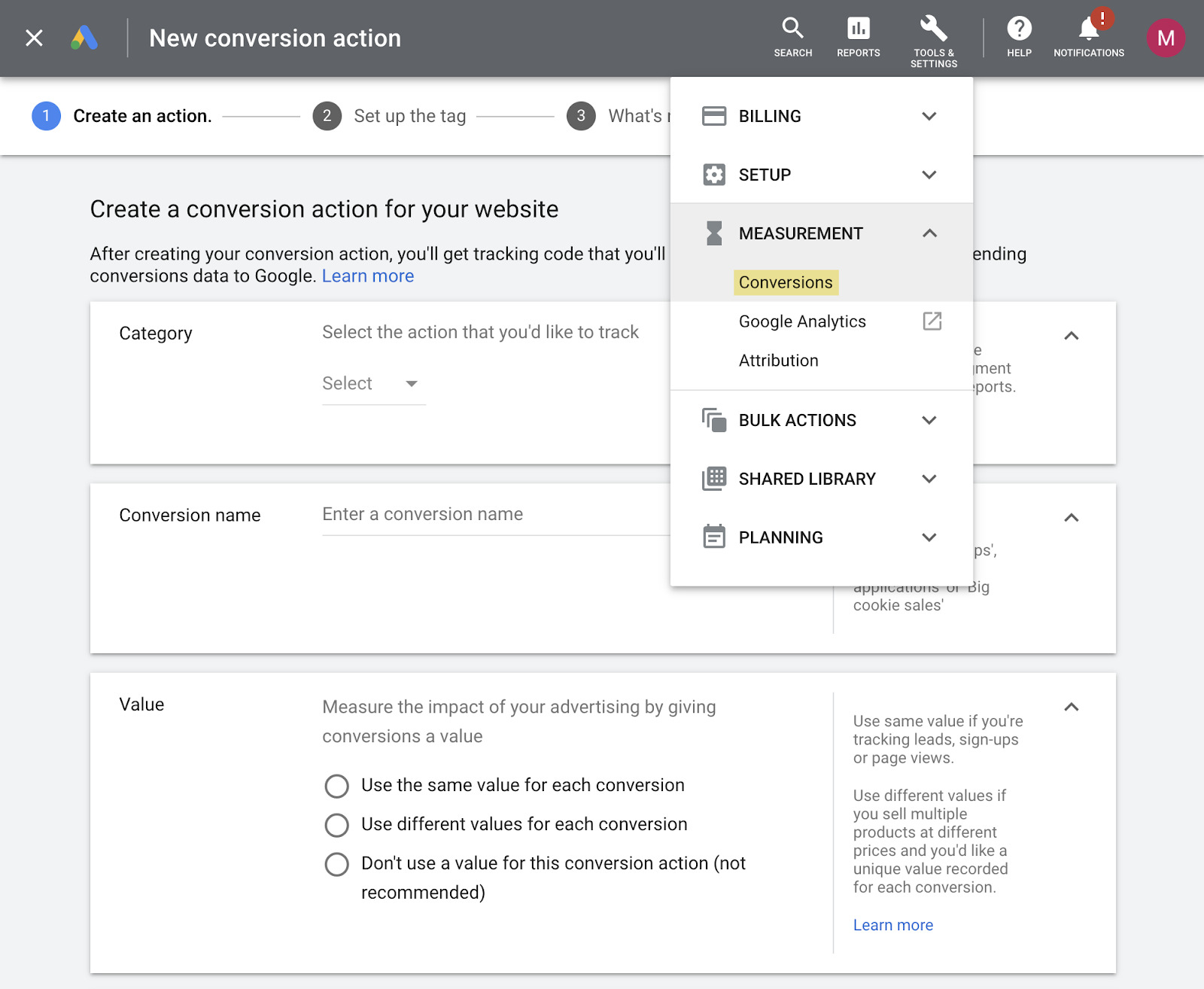 Je vous recommande chaudement de correctement paramétrer le suivi des conversions avant de lancer vos campagnes. Compter une conversion lorsqu’un client achète un produit est ici la base, mais vous devriez aussi compter la valeur de conversion en plus. C’est relativement simple, mais vous aurez peut-être besoin de l’aide d’un développeur. Suivez les instructions lorsque vous paramétrez les conversions :