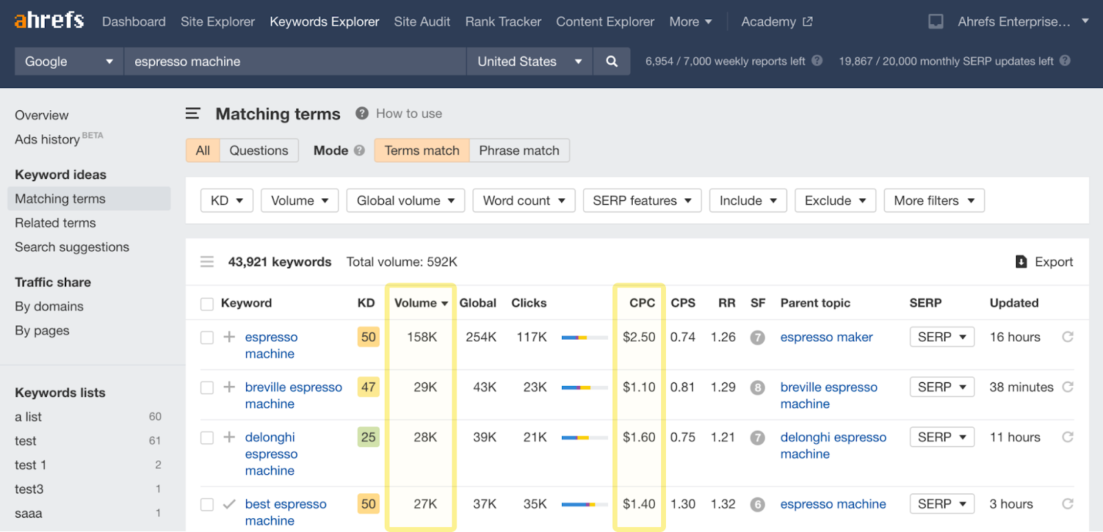 Pour les annonces de recherche, vous devez faire de la recherche de mots-clés. La plupart des gens associent cela avec le SEO, mais c’est également indispensable pour les annonces de recherche PPC. Vous devez d’abord savoir ce que cherchent les gens et ensuite combien vous allez avoir à dépenser par clic en moyenne.