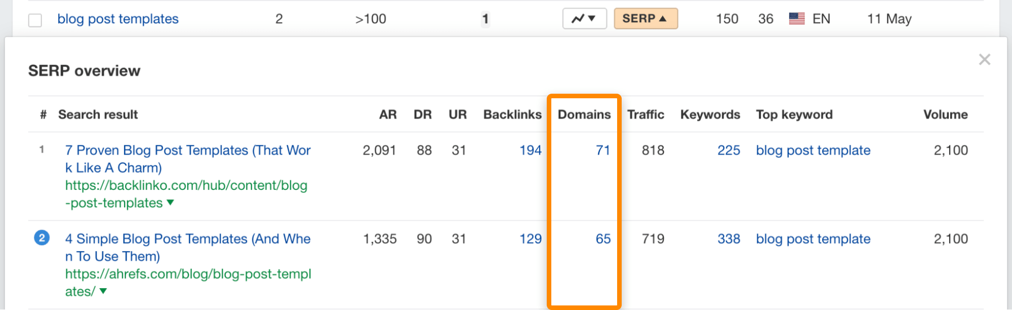 Dans le cas de “blog post template”, Backinko n’est qu’à une position au-dessus de nous, en première place, et nous avons environ le même nombre de backlinks.
