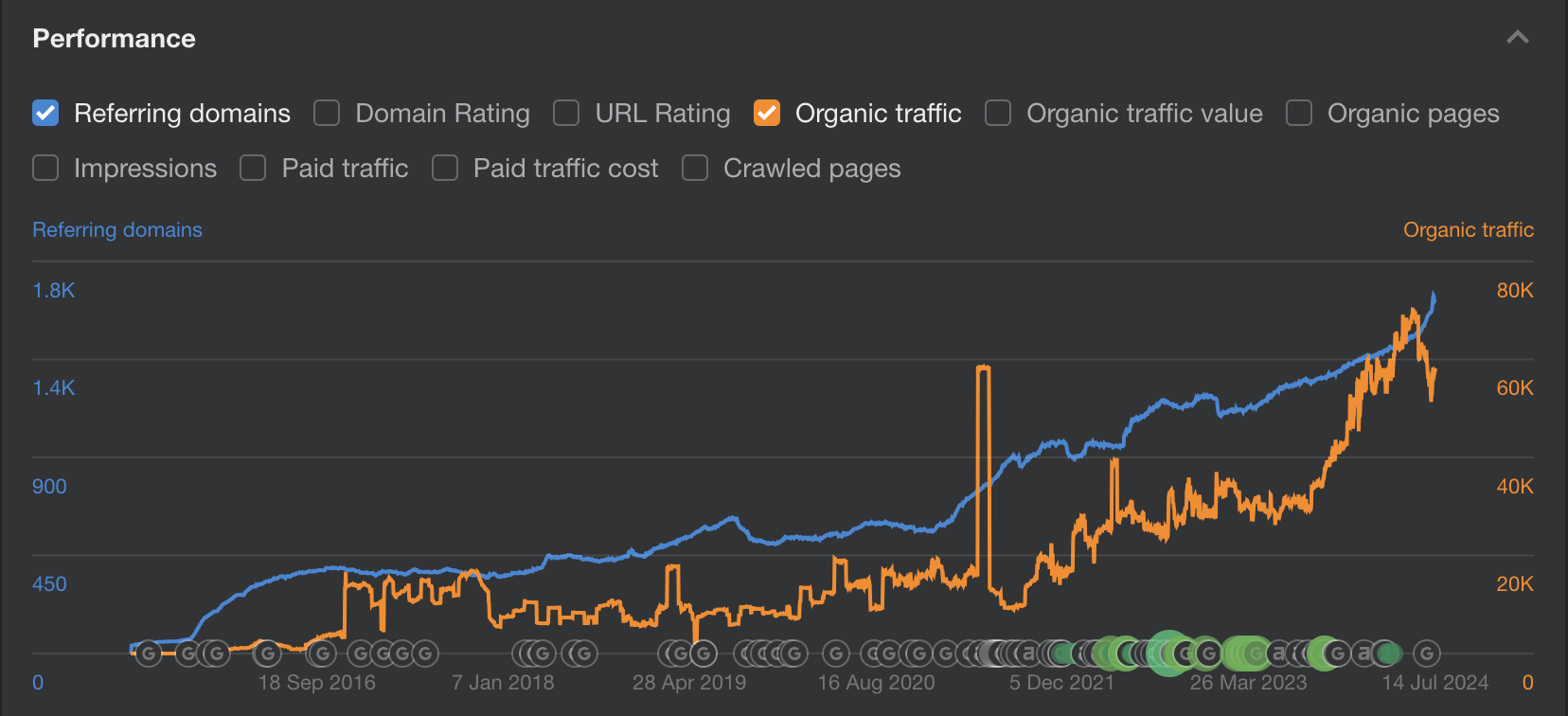 Enfin, il est possible de montrer à votre client la corrélation entre votre travail sur l’acquisition de backlinks et l’évolution du trafic organique. Pour ce faire, il suffit de se rendre dans l’Overview du site concerné et de cocher les cases “Referring domains” et “Organic traffic”. Ainsi, vous êtes en mesure de dire à votre client que votre travail sur le pilier popularité corrèle bien avec l’évolution du trafic organique. Vous pouvez inclure une capture d’écran de ce type dans votre rapport SEO.