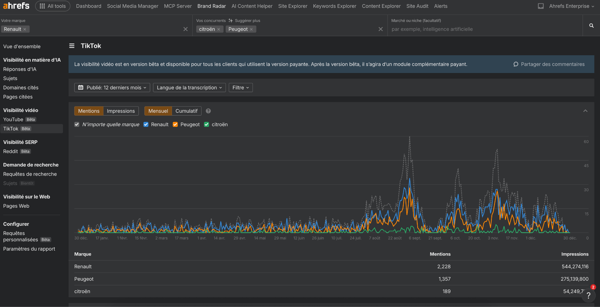 Brand Radar inclut désormais TikTok. La section Visibilité vidéo couvrait déjà YouTube, et TikTok vient maintenant s’y ajouter. Vous pouvez ainsi voir où votre marque apparaît dans des vidéos à fort trafic.