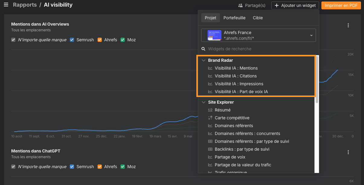 Les widgets Brand Radar prennent désormais en charge davantage d’indicateurs de visibilité IA, notamment les Citations, les Impressions et la Part de Voix IA, et plus seulement les Mentions.