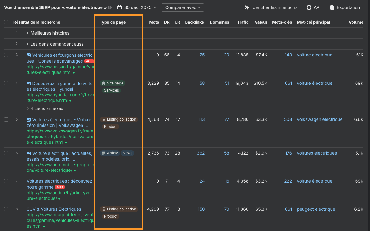Grâce à l’IA, nous classons le type de contenu qui se positionne, comme les articles, les pages de destination ou les outils, avec des sous-types tels que guides pratiques, listicles ou pages produit. Cela permet de comprendre en un coup d’œil ce que Google valorise pour une SERP donnée.