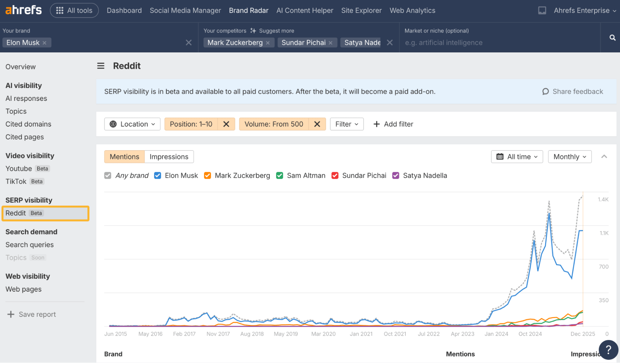 Nous avons ajouté un nouvel index Reddit dans les SERP qui montre à quel point votre marque est visible dans les résultats Reddit positionnés sur Google.