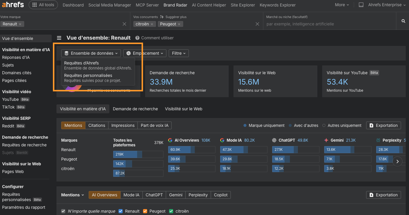 Brand Radar fonctionne désormais avec deux ensembles de données. L’ensemble de données global d’Ahrefs et les requêtes personnalisées de votre projet. Vous pouvez consulter les deux dans un même rapport ou basculer de l’un à l’autre via le nouveau filtre Ensemble de données, selon que vous souhaitez une visibilité au niveau du marché ou au niveau des acheteurs.