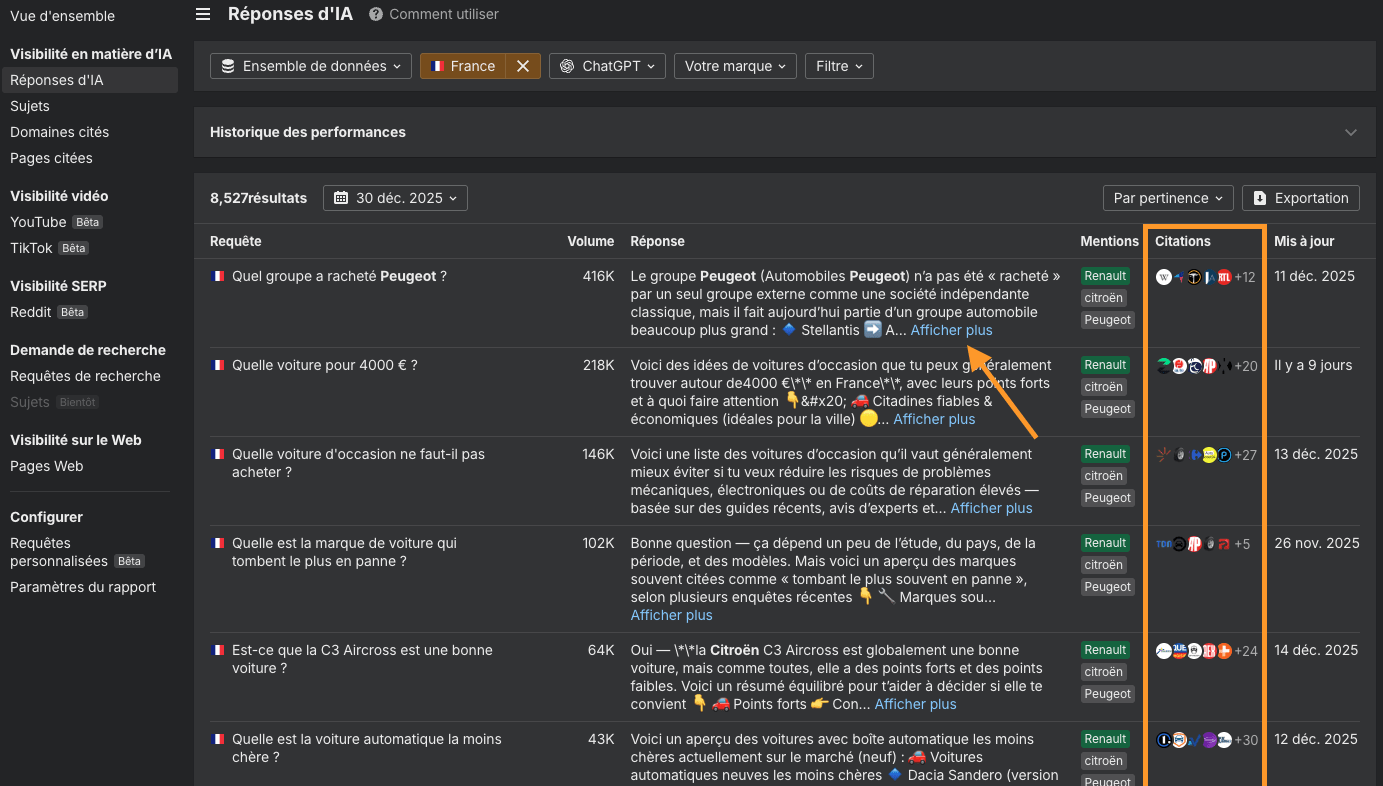 Les longues réponses IA sont désormais repliées par défaut, avec les détails complets accessibles dans un panneau latéral. Nous avons ajouté des colonnes pour les marques mentionnées ainsi que des favicons pour les sites web cités, ce qui facilite nettement l’identification de tendances dans les résultats.