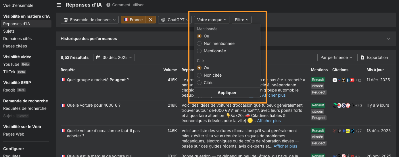 Vous pouvez désormais inclure ou exclure votre propre marque des mentions et des citations dans les rapports de Visibilité IA en un seul clic. Cela facilite la distinction entre la visibilité portée par votre marque et le bruit lié aux concurrents ou à la catégorie.