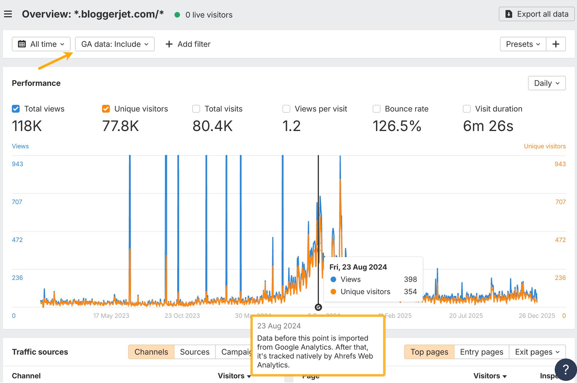 Si votre compte Google est lié à un projet, nous importerons les données passées issues de Google Analytics antérieures au démarrage du suivi natif de Web Analytics, afin que vos rapports ne commencent pas à zéro.